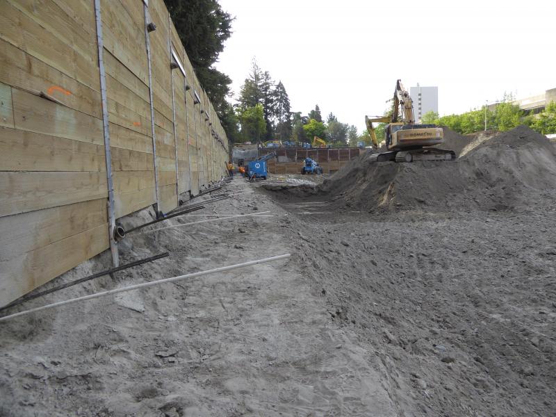 Chudgar developed design for temporary and permanent shoring for support of excavation. Soldier piles with tiebacks are used for retained heights over 12 feet, with three levels of tiebacks to achieve 50 feet of excavation depth. Construction excavator and concrete pump truck loading adjacent to excavation resulted in significant surcharge loads that required heavy pile sections. Tiebacks were coordinated to maintain minimum clearance as required by geotechnical.